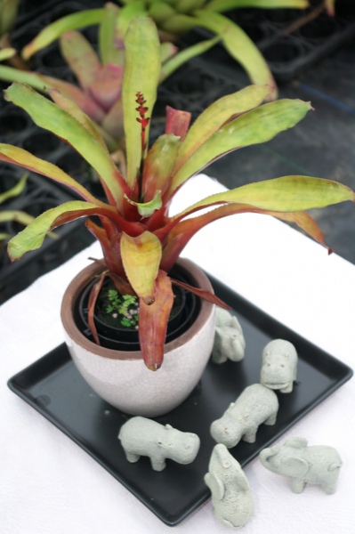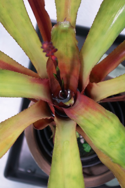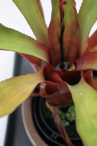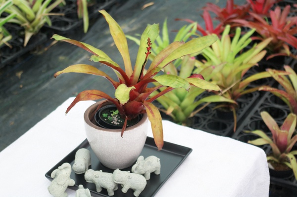 辨別特點: 中型款,葉正面呈黃綠色,反面咖啡紅,葉緣幾乎無刺,明顯特徵是直立花桿,與及類似的Foster's Favorite不同.