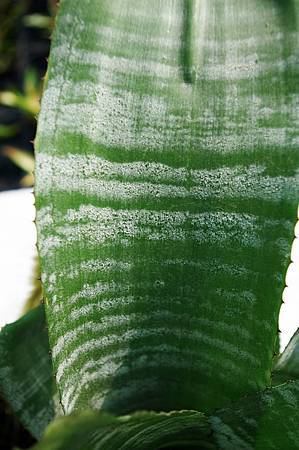 辨別特點: 中型款,葉墨綠色,葉身挺立較硬,葉正反面帶有銀斑橫紋,多數銀斑較細,葉緣有刺.