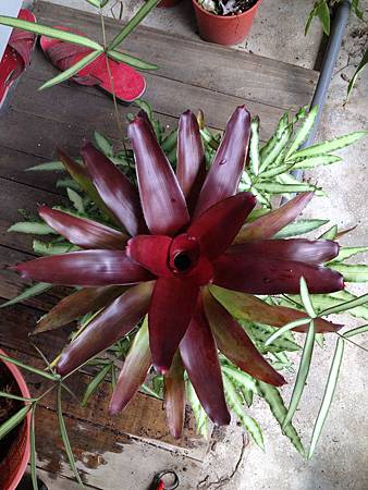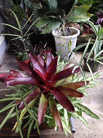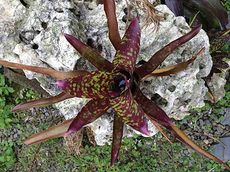 我在去年夏天的時候,塞了幾顆約展葉15公分的五彩鳳梨到圖中大型枯老石的孔中,當時葉面的顏色還是幾近全綠,微透斑紋.