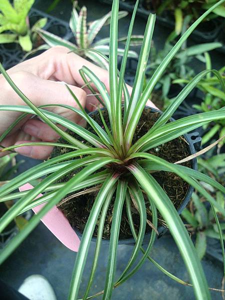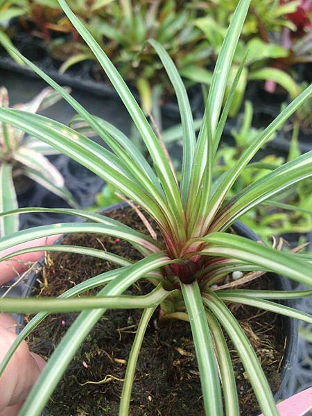辨別特點: 中小型款(20公分左右),葉色帶有內白條紋,有溫差及日照的地方,葉面還會透出紅色,鮮豔的桃紅花苞,紫紅色小花,生長速度較慢.