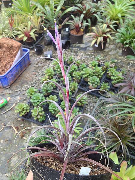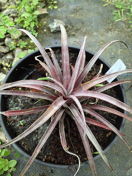 辨別特點: 中小型款(展葉直徑12-15公分左右,應該還可以再大一些),強健的品種,葉面有些厚度,葉面呈咖啡紅色帶銀麟,同色花梗,紫色管狀花,生長速度稍緩慢,側芽量不多.